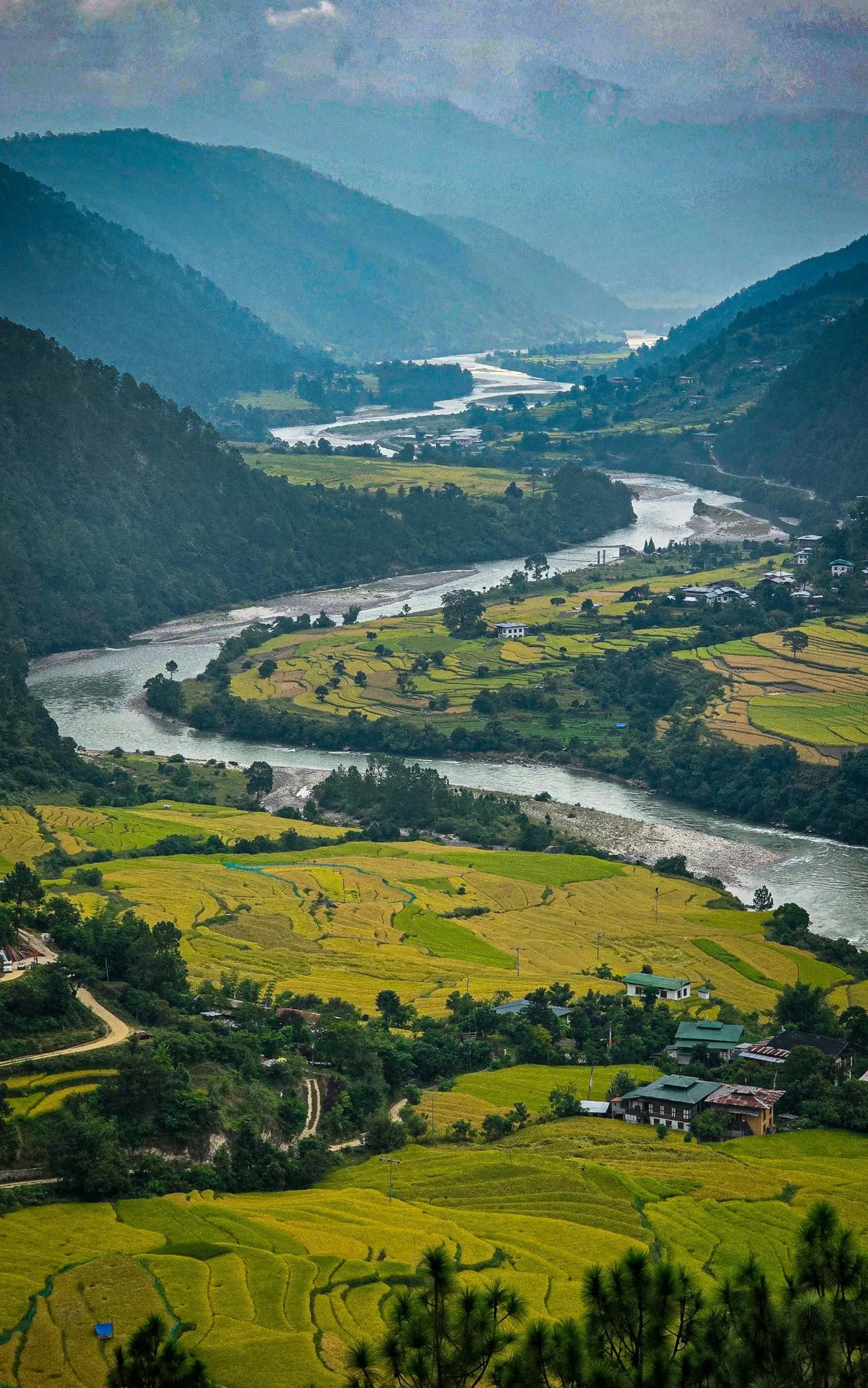 Though small in size, Bhutan’s landscapes are nothing short of awe-inspiring. The country is roughly 350 km long and 150 km wide, with a population around 750,000. Despite its size, Bhutan's rugged Himalaya mountain terrain is some of the most dramatic in the world. Everywhere we look, we are surrounded by lush forests, rivers, rice paddies, and charming traditional homes with intricate colirful designs.